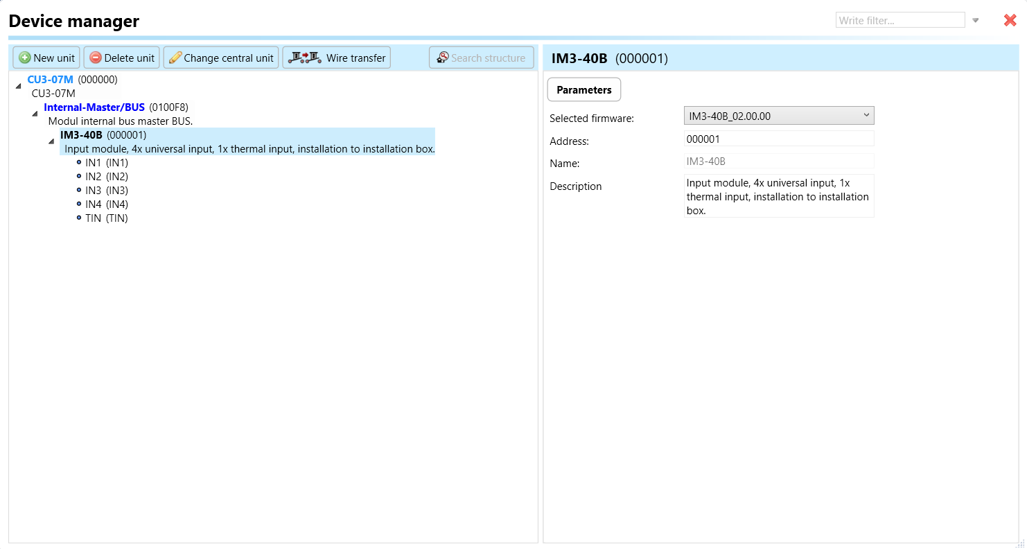 Válassza a "Eszközkezelő" (1. ábra)> Hozzáadás "Új egység "> Válassza ki a központi egységet > Hozzáadás "Új egység">Válassza az "Internal-Master/BUS"> Hozzáadás "Új egység "> Adja hozzá az eszközöket> Kattintson az eszközökre a "Paraméterek" megtekintéséhez.
