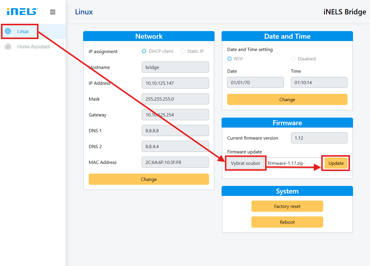 Go back to "Linux" menu and below current FW is field, where you can select file with FW to update and press button "Update: