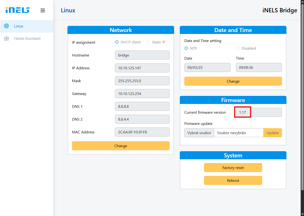 New FW "1.17" is coming with: HA Core version 2024.3.3, So it is not necessary to Update the HA core version in the iNELS Bridge web configuration page.