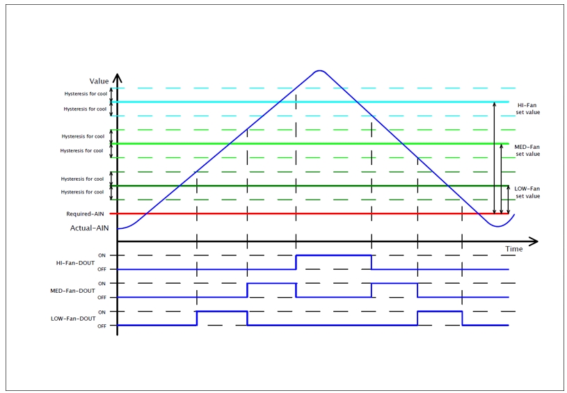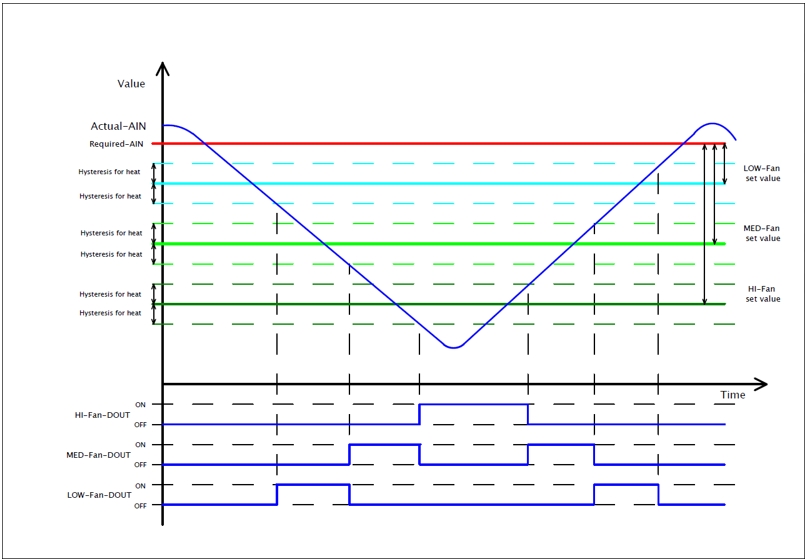 Decreasing the current value by “Actual-AIN under the limit provided by “HI-Fan set value” whose value is decreased by value of hysteresis “Hysteresis for cool“, changes the state of digital output “HI-Fan-DOUT” to “OFF”(logical 0), while “MED-Fan-DOUT” switches to “ON”(logical 1).