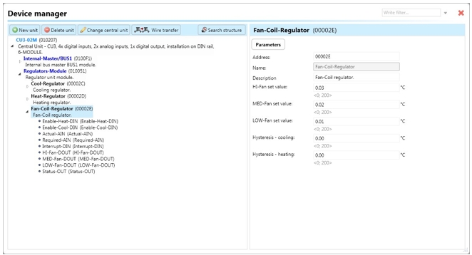 Select the "Device manager" > Add "New unit "> Select the central unit > Add "New unit">Select the "Regulators-Module".