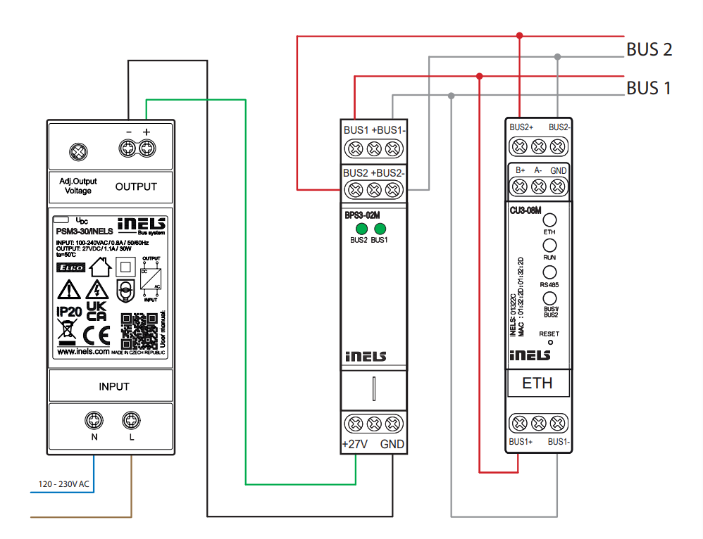 The iNELS bus utilizes a twisted pair cable for both power and data transfer, operating at DC 27V. The rated voltage of the bus system is 27 V, and the voltage provided by the power supplies is 27 V. The bus devices work without error at voltages between 21 V and 27 V, so a tolerance range of 6 V is available to compensate for voltage drops in the cable, and contact resistance. In the bus system, bus separator units, BPS3-01M and BPS3-02M units are used for impedance separation of the BUS from the supply voltage source. The outputs are equipped with overcurrent and surge protection.