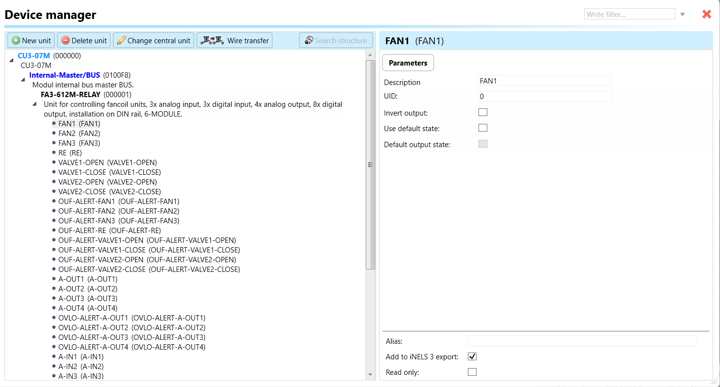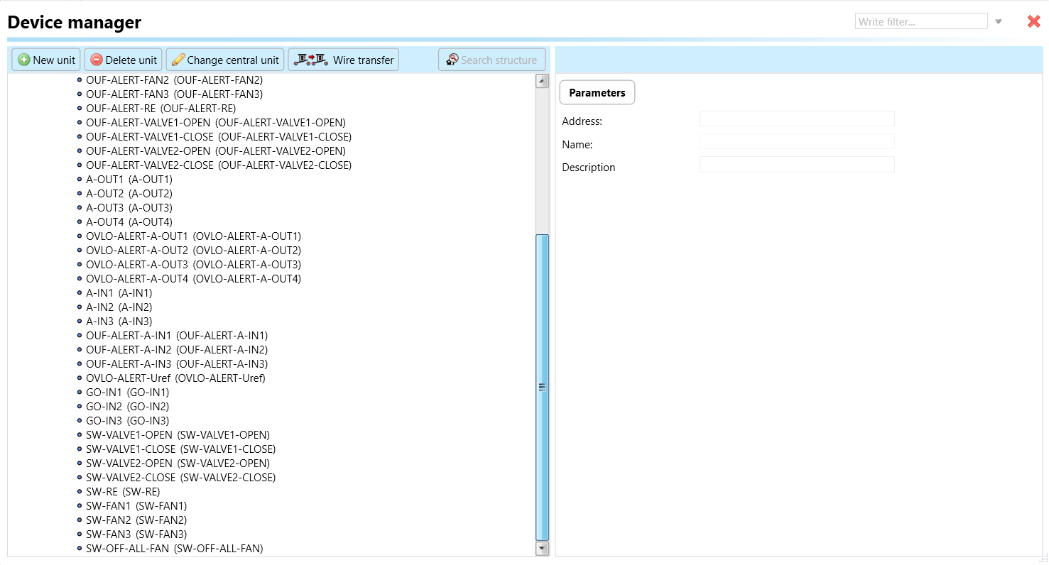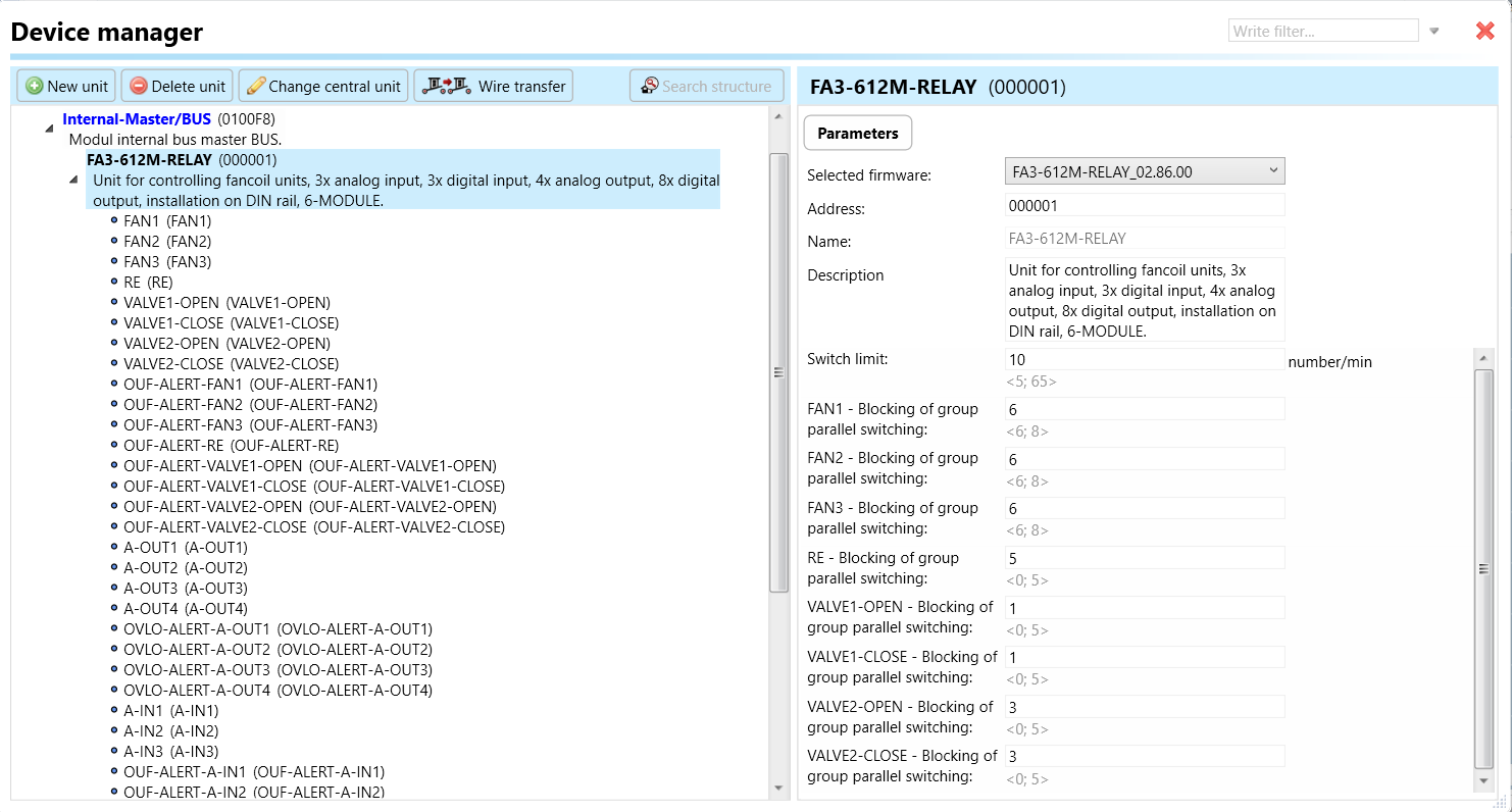 Select the "Device manager" (Fig 1)> Add "New unit "> Select the central unit > Add "New unit">Select the "Internal-Master/ BUS"> Add "New unit "> Add the devices> Click on the devices to see the "Parameters".