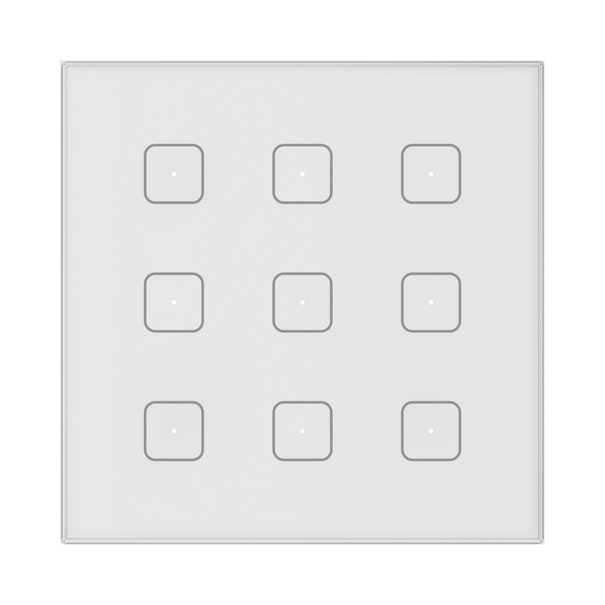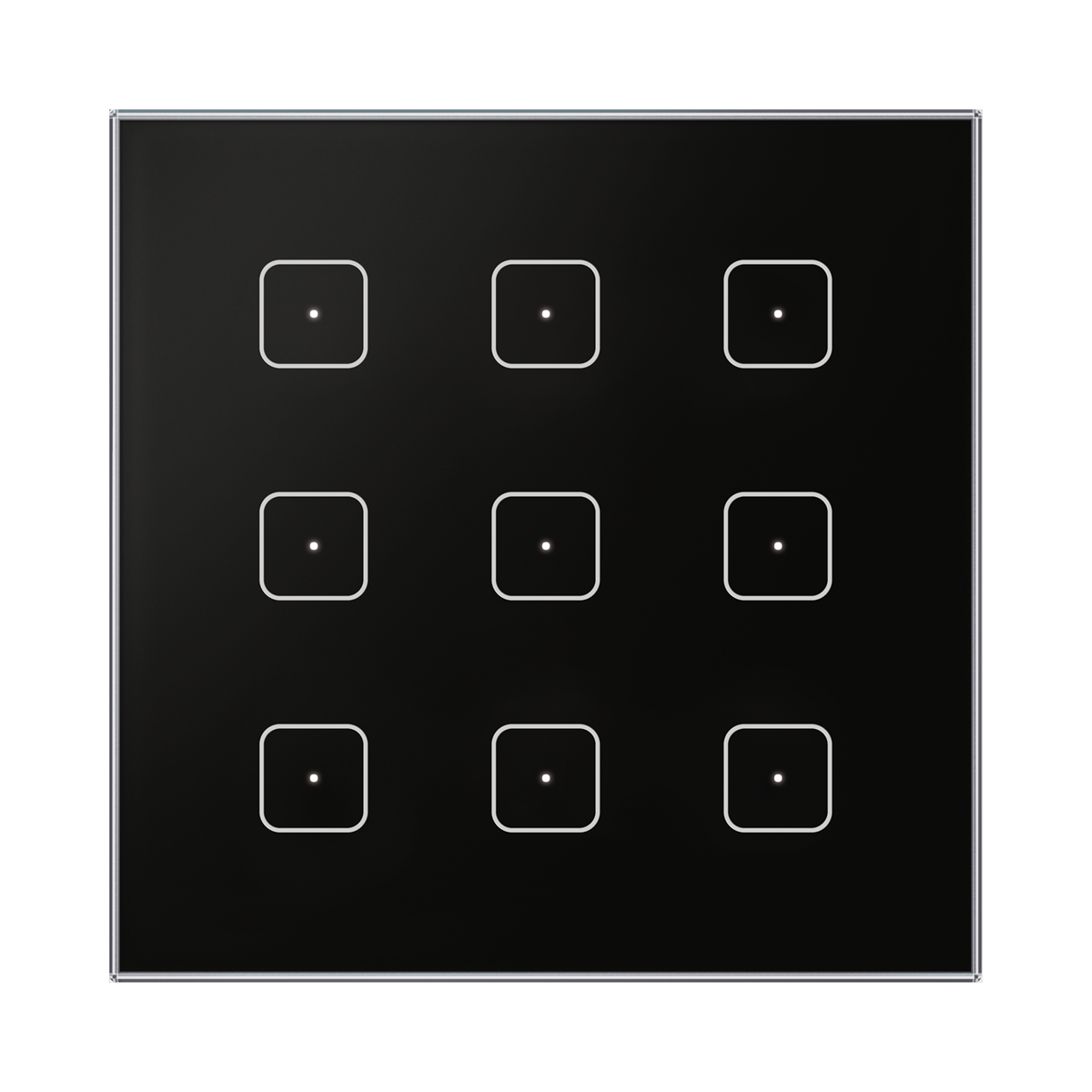Wall-mounted glass touch controls, sharp, 9-button, built-in temperature sensor, 1x temperature input, 1x digital input.