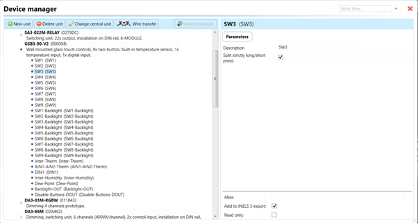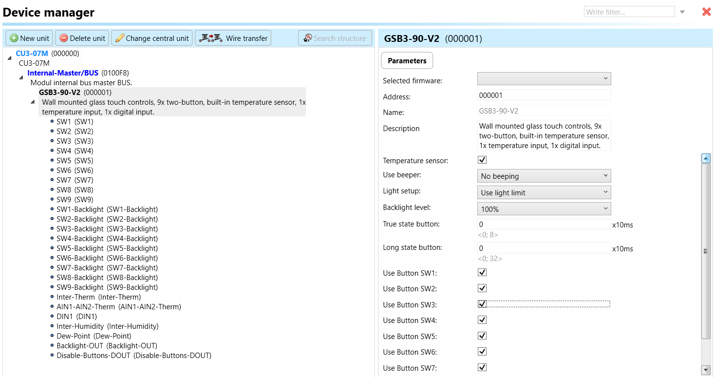 Select the "Device manager" (Fig 1)> Add "New unit "> Select the central unit > Add "New unit">Select the "Internal-Master/ BUS"> Add "New unit "> Add the devices> Click on the devices to see the "Parameters".