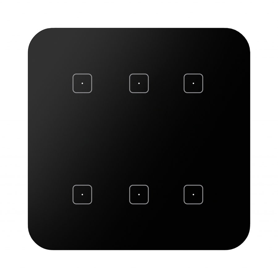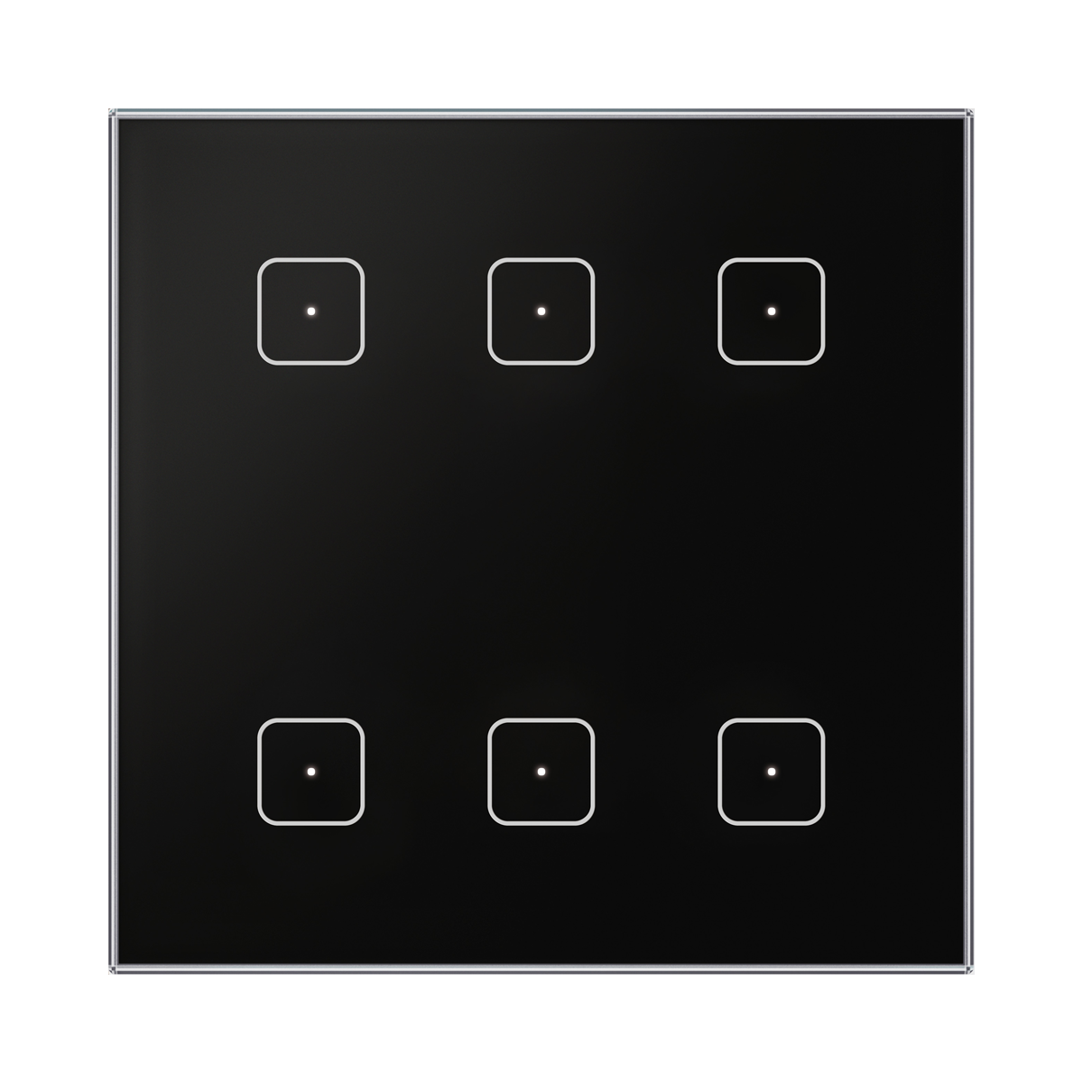 Wall-mounted glass touch controls, sharp, 6-button, built-in temperature sensor, 1x temperature input, 1x digital input.