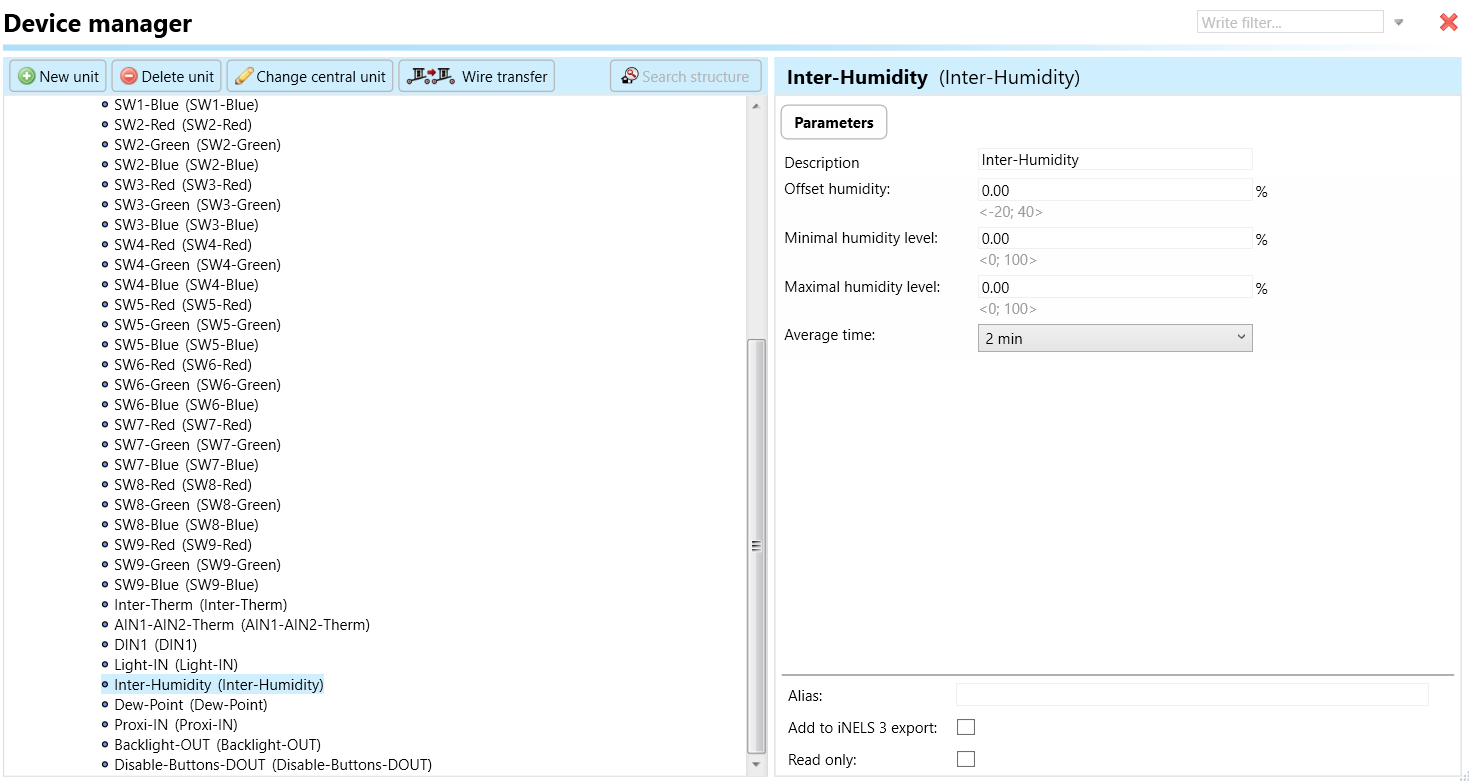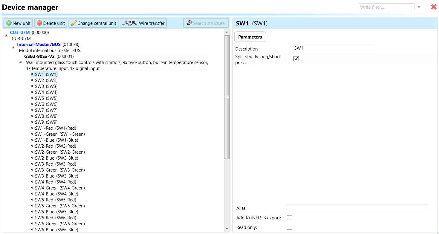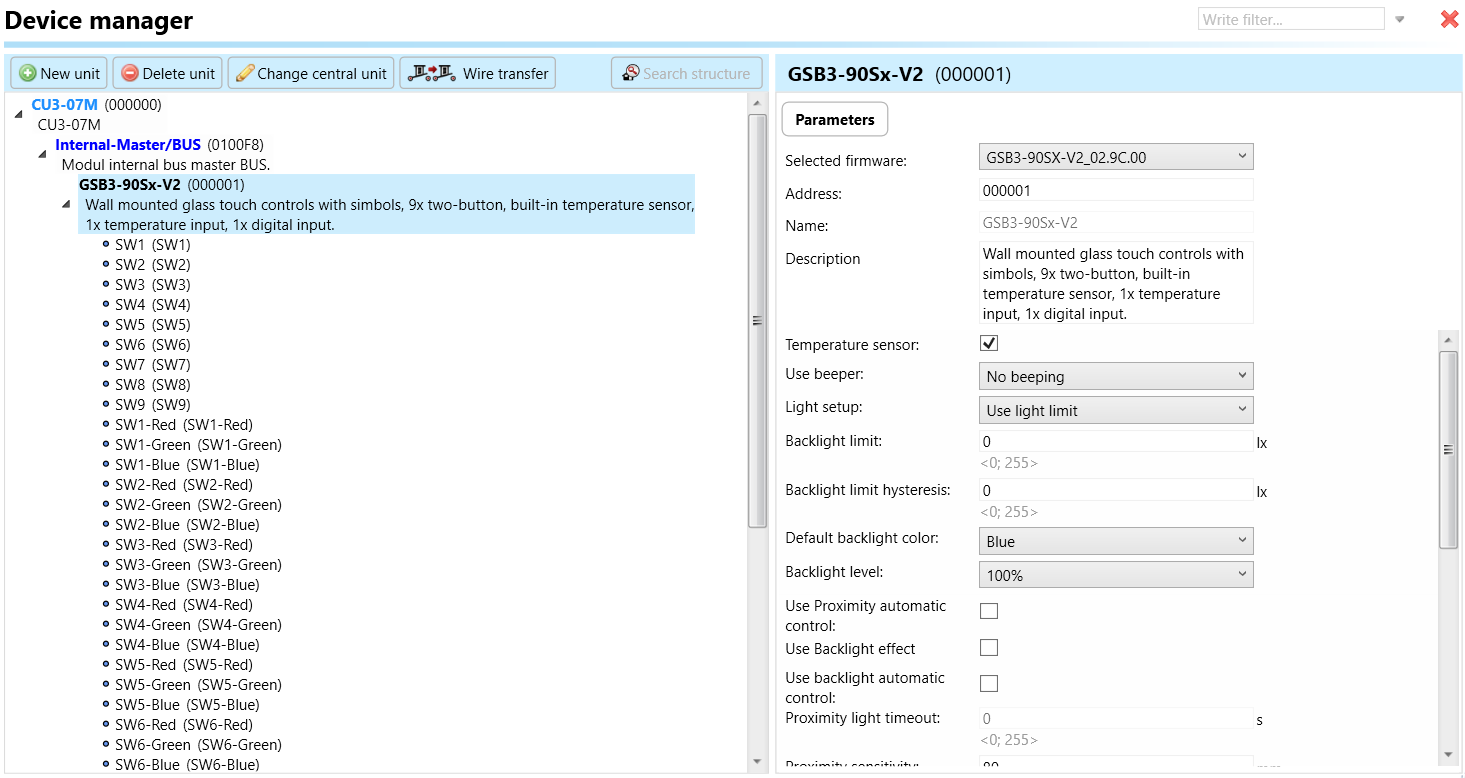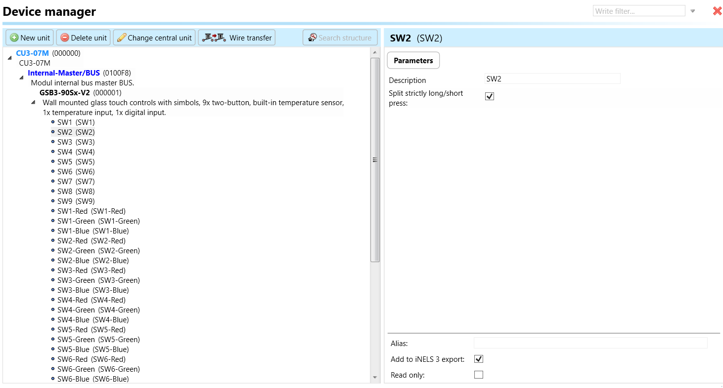 Select the "Device manager" (Fig 1)> Add "New unit "> Select the central unit > Add "New unit">Select the "Internal-Master/ BUS"> Add "New unit "> Add the devices> Click on the devices to see the "Parameters".
