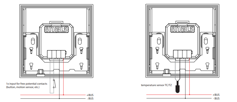 Integrated Sensors: The buttons are equipped with integrated temperature sensors and analog-to-digital inputs (AIN/DIN), allowing connection to potential-free contacts or external temperature sensors for various applications such as floor temperature measurement.