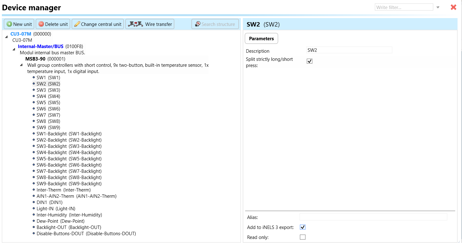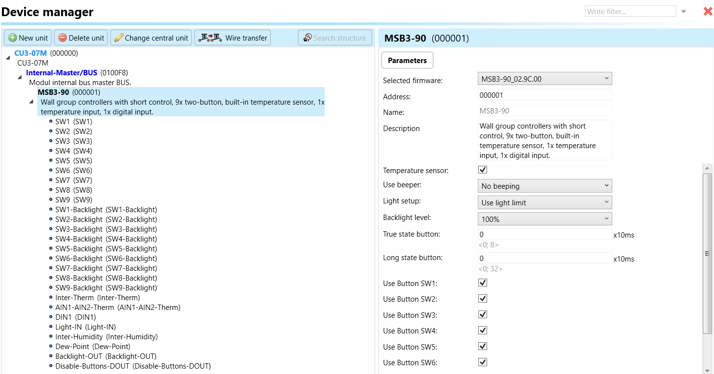 Select the "Device manager" (Fig 1)> Add "New unit "> Select the central unit > Add "New unit">Select the "Internal-Master/ BUS"> Add "New unit "> Add the devices> Click on the devices to see the "Parameters".