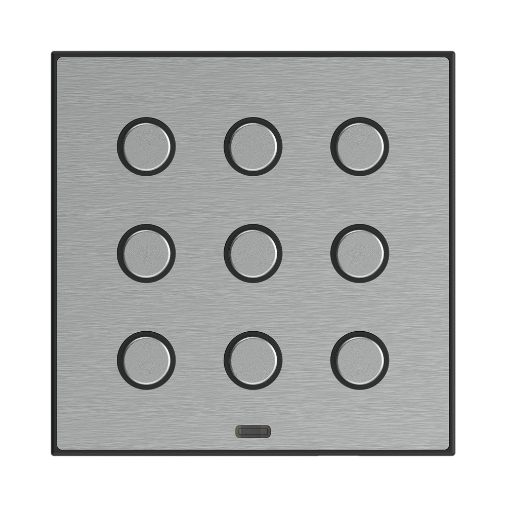 Wall-mounted metal touch controls, 9-button, built-in temperature sensor, 1x temperature input, 1x digital input.