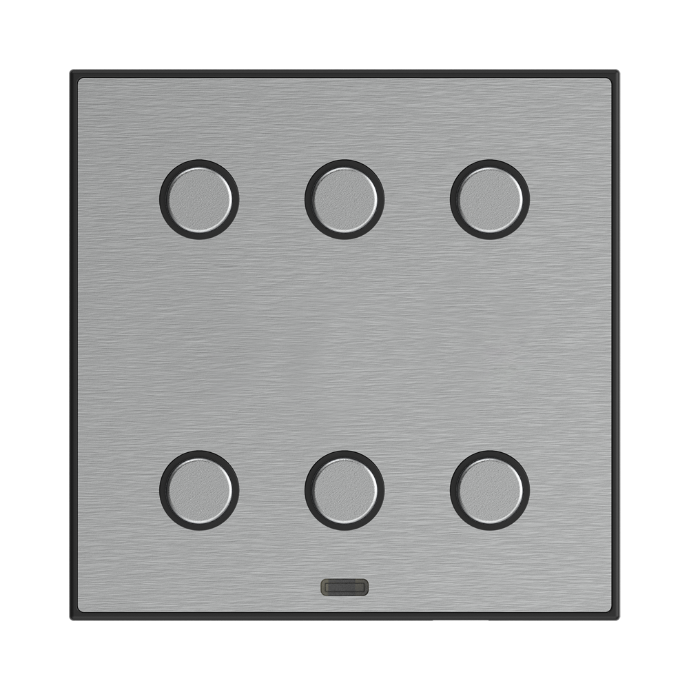 Wall-mounted metal touch controls, 6-button, built-in temperature sensor, 1x temperature input, 1x digital input.