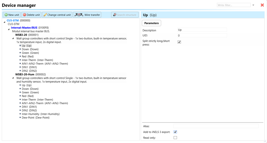 Select the "Device manager" (Fig 1)> Add "New unit "> Select the central unit > Add "New unit">Select the "Internal-Master/ BUS"> Add "New unit "> Add the devices> Click on the devices to see the "Parameters".