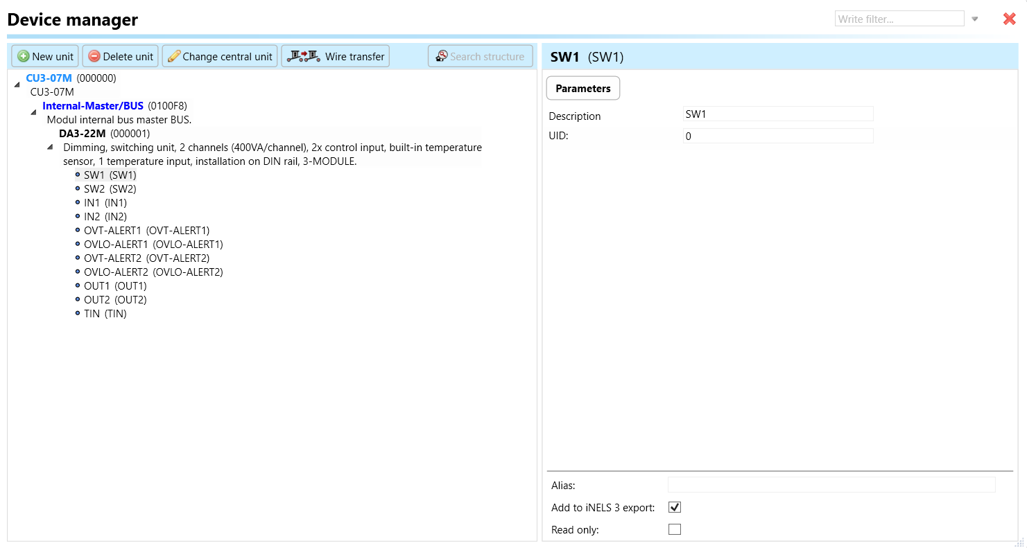 Select the "Device manager" (Fig 1)> Add "New unit "> Select the central unit > Add "New unit">Select the "Internal-Master/ BUS"> Add "New unit "> Add the devices> Click on the devices to see the "Parameters".