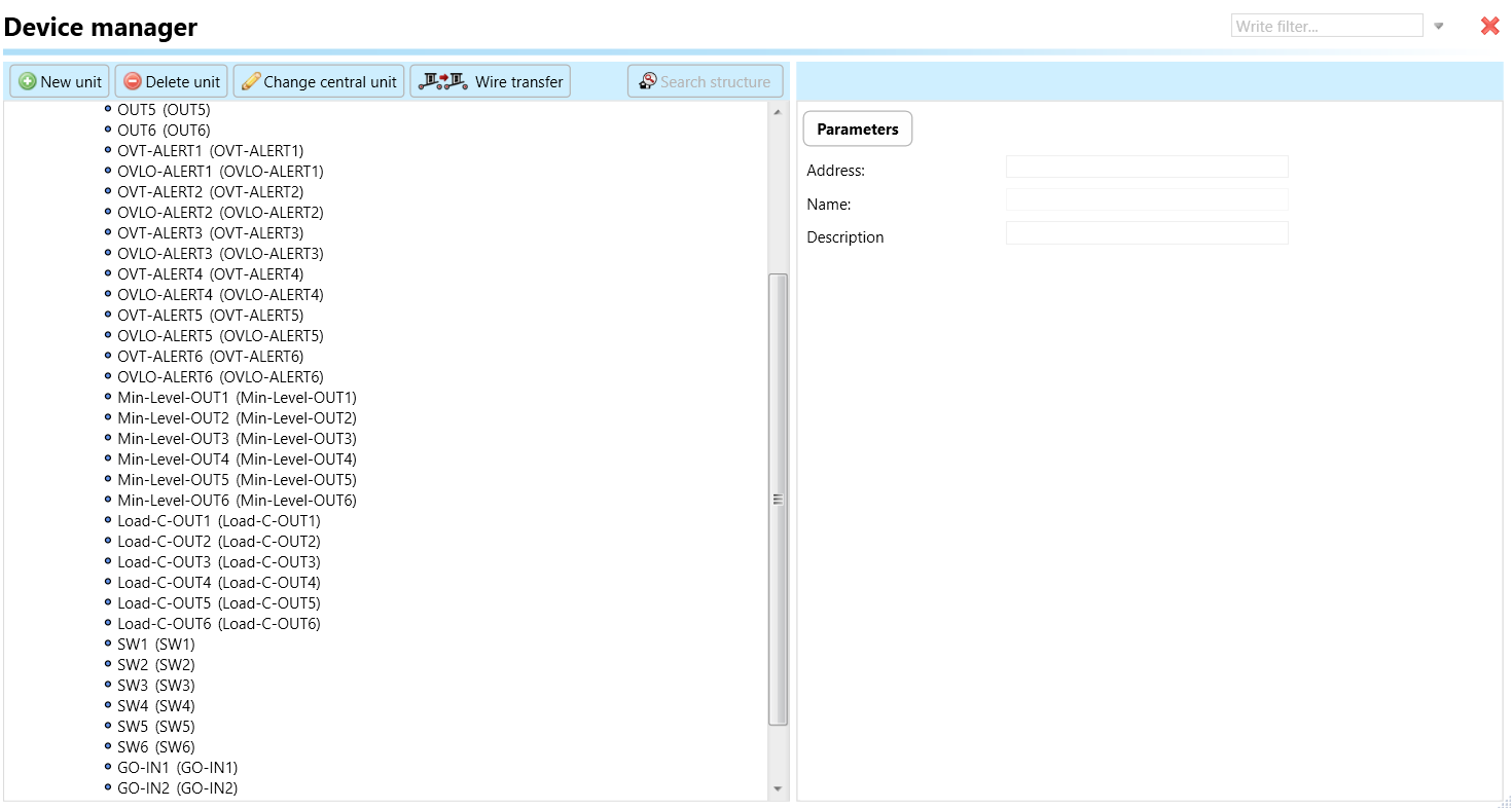Select the "Device manager" (Fig 1)> Add "New unit "> Select the central unit > Add "New unit">Select the "Internal-Master/ BUS"> Add "New unit "> Add the devices> Click on the devices to see the "Parameters".