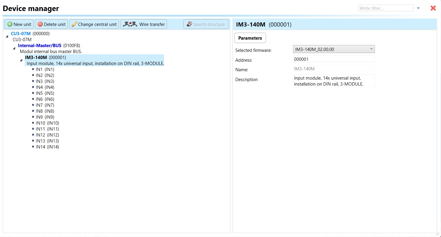 Select the "Device manager" (Fig 1)> Add "New unit "> Select the central unit > Add "New unit">Select the "Internal-Master/ BUS"> Add "New unit "> Add the devices> Click on the devices to see the "Parameters".