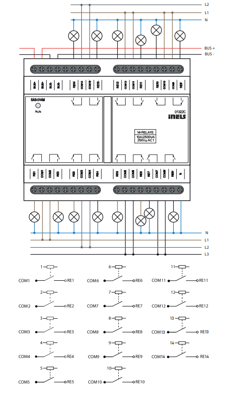 Control and Addressing: Individual control and addressing for each of the fourteen output contacts. Communication via BUS for control and addressing. The contact status of each relay can be changed separately and manually by control buttons on a front panel.