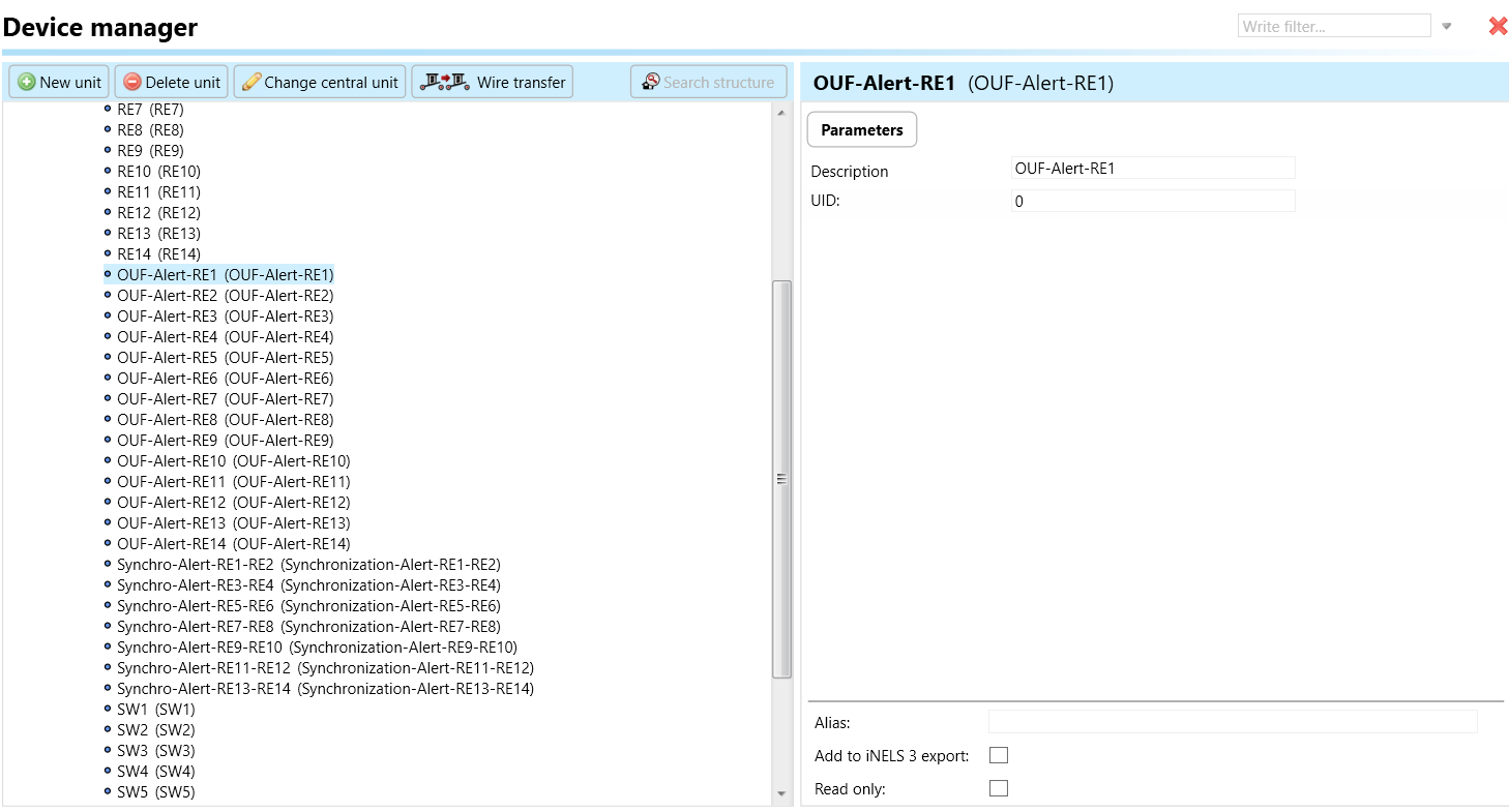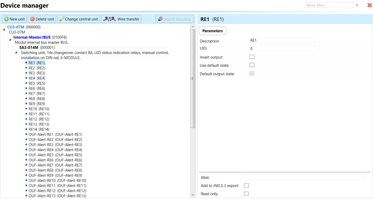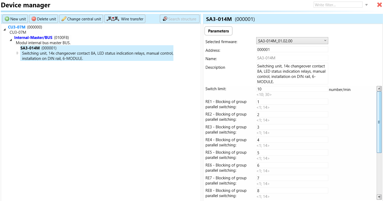Select the "Device manager" (Fig 1)> Add "New unit "> Select the central unit > Add "New unit">Select the "Internal-Master/ BUS"> Add "New unit "> Add the devices> Click on the devices to see the "Parameters".