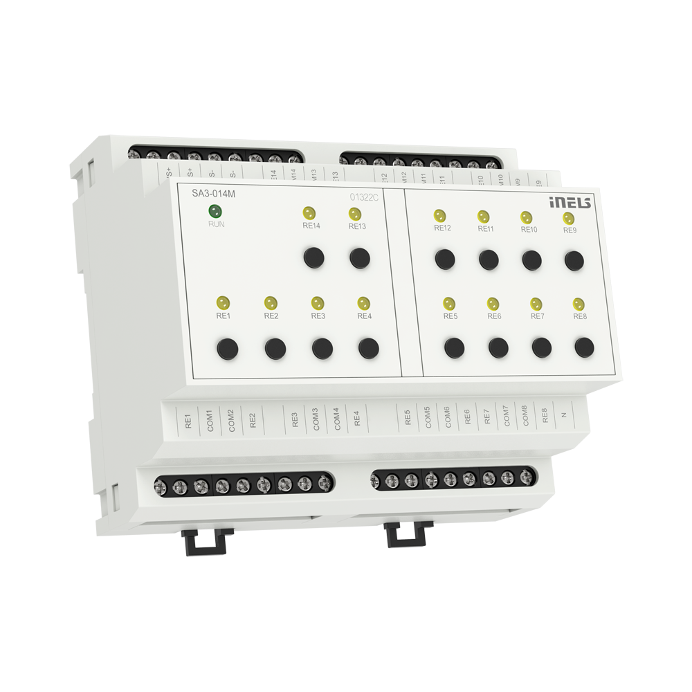 SW1-SW14: A "switch" could refer to a virtual or physical switch that controls a specific function within the SA3-014M. For example, you might have switches to control lights, heating, or other smart devices in your installation. These switches can be programmed and configured within the iNELS Design Manager to customize the behaviour of your system.