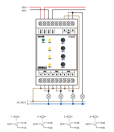 Device Overview: The SA3-04M is a switching actuator equipped with 4 independent relays featuring changeover potential-free contact. It is designed to handle a variety of loads or appliances through its relay outputs.