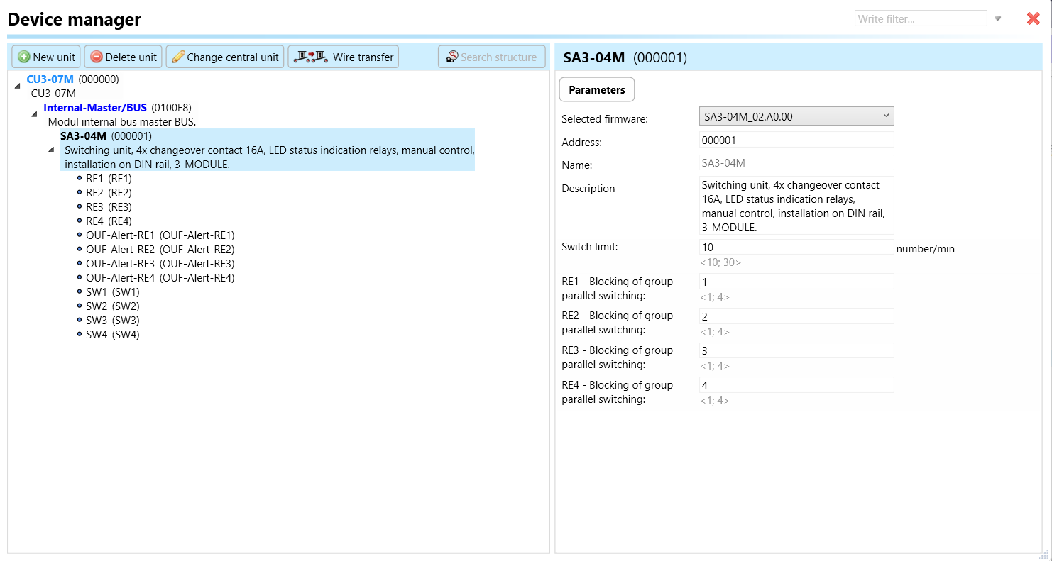 Select the "Device manager" (Fig 1)> Add "New unit "> Select the central unit > Add "New unit">Select the "Internal-Master/ BUS"> Add "New unit "> Add the devices> Click on the devices to see the "Parameters".