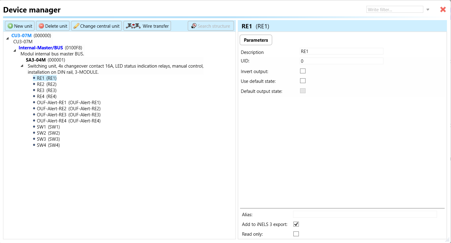 Select the "***Device manager"*** (***Fig 1***)> Add "***New unit*** "> Select the central unit > Add "***New*** ***unit"***>Select the "***Internal-Master/ BUS">*** Add "***New unit*** "> Add the devices> Click on the devices to see the "***Parameters"***.