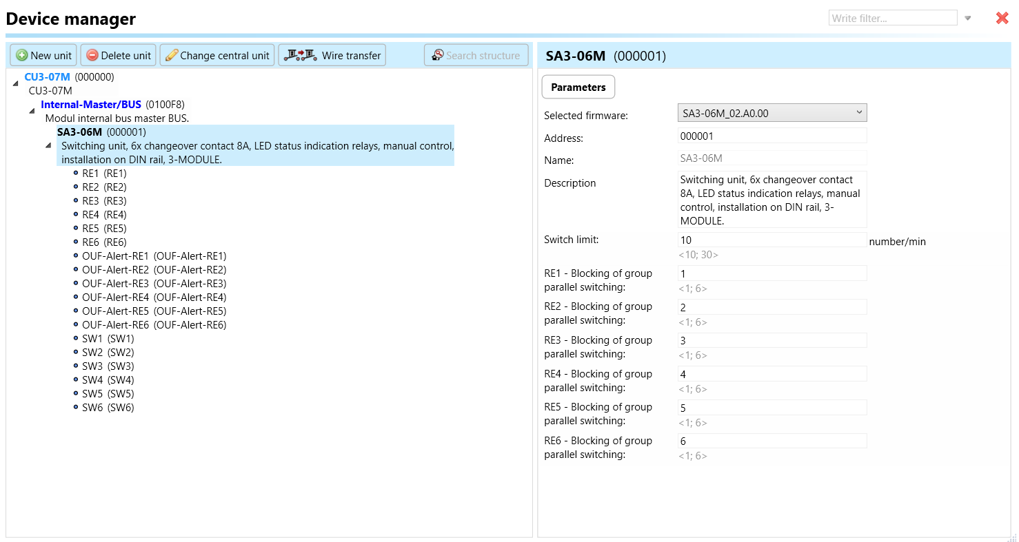 Select the "Device manager" (Fig 1)> Add "New unit "> Select the central unit > Add "New unit">Select the "Internal-Master/ BUS"> Add "New unit "> Add the devices> Click on the devices to see the "Parameters".