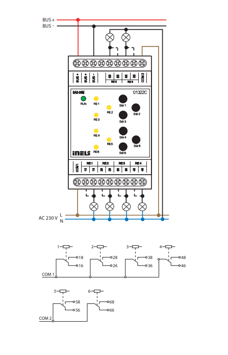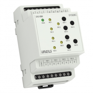 SW1-SW 6: A "switch" could refer to a virtual or physical switch that controls a specific function within the SA3-06M. For example, you might have switches to control lights, heating, or other smart devices in your installation. These switches can be programmed and configured within the iNELS Design Manager to customize the behaviour of your system.