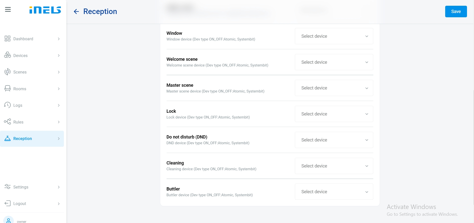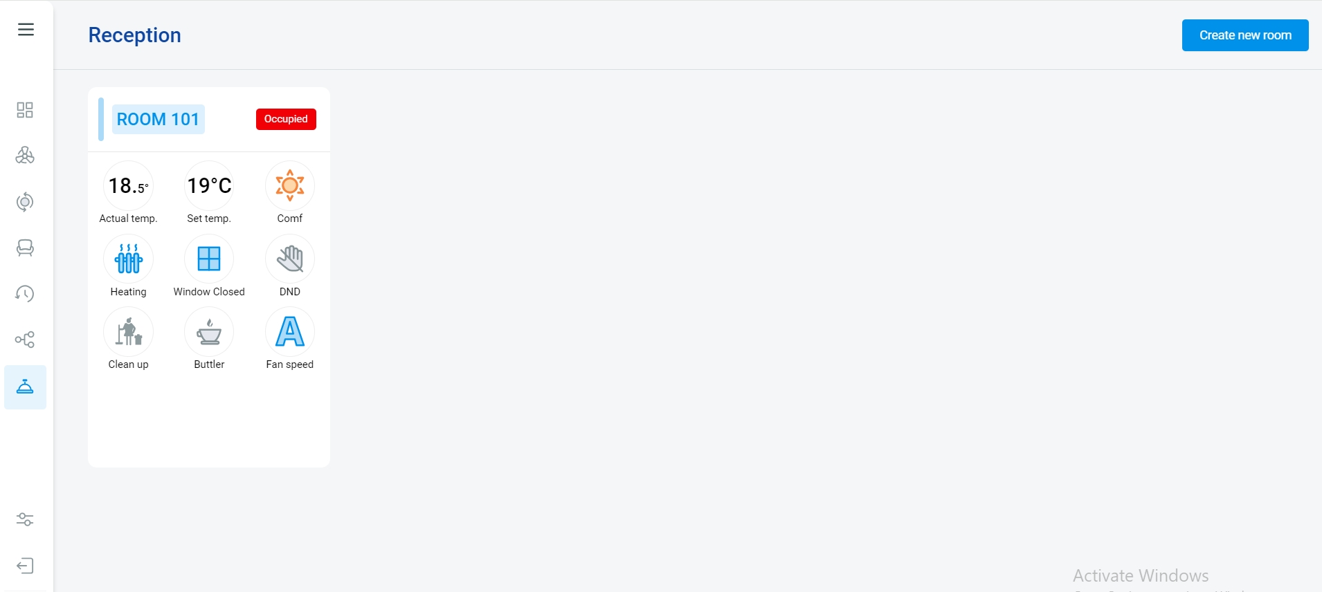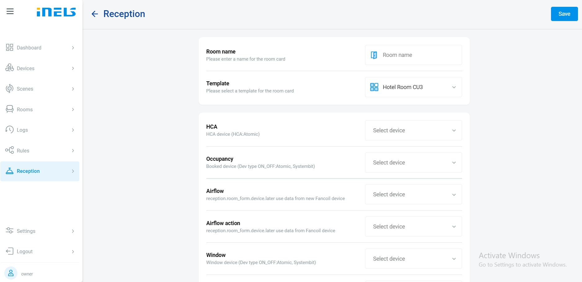 In the INELS Cloud Platform, the "Reception" section refers to a feature where users can manage and monitor various aspects related to individual rooms within a building or facility. This section allows users to add each room to the system and track essential information such as occupancy status, temperature, heating status, "Do Not Disturb" (DND) settings, and other relevant details.