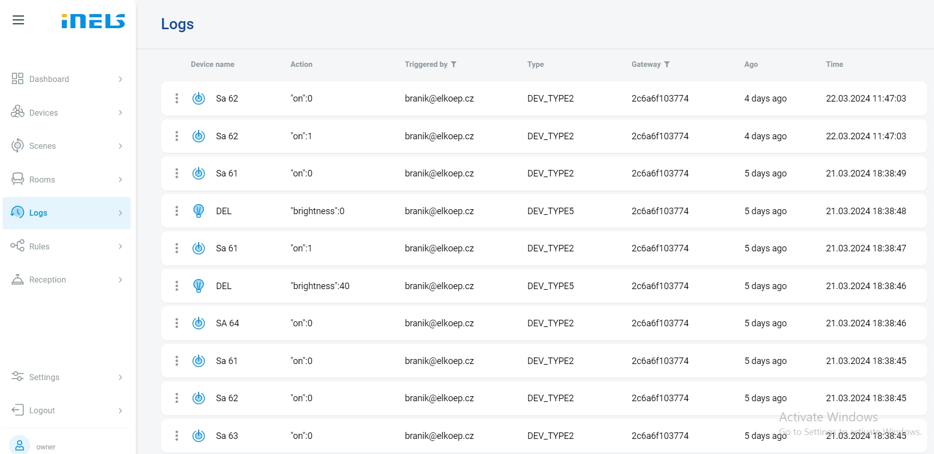 The "Event Logs" specifically record changes made through user control via cloud connection, irrespective of whether the changes are initiated through the iNELS mobile application or the inels.cloud website. This means that any actions, adjustments, or modifications carried out by users through these cloud-based platforms are documented and logged in this section. These logs provide a comprehensive record of user-initiated activities within the system, offering transparency and accountability for any modifications made to the connected devices, settings, or configurations.