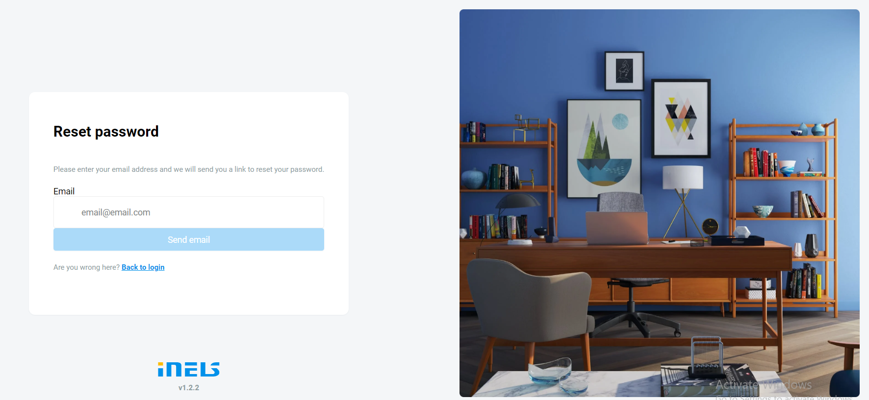 Simply navigate to the login page (https://inels.cloud/auth/login), and click the forgot password section. This will navigate to the Reset password page.