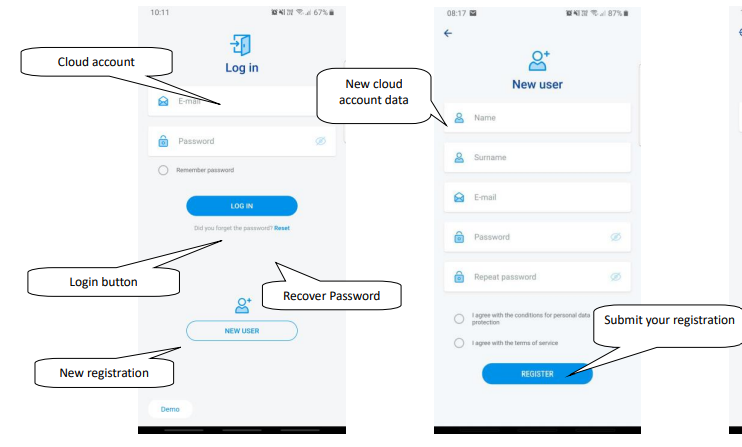 When you first activate the app, you will see a login screen. It is possible to log in with the original iNELS Cloud or create a new registration.