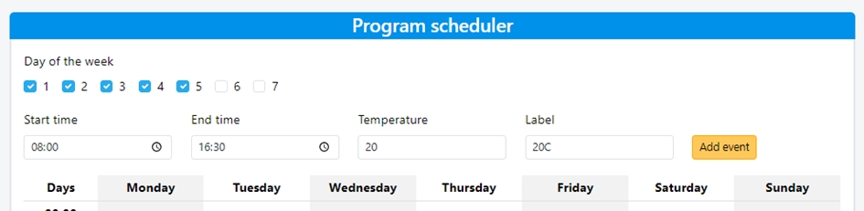 08:00 – 23:00: 21°C This schedule allows for optimized energy consumption and ensures that heating is active only during the desired times and at the specified temperatures.